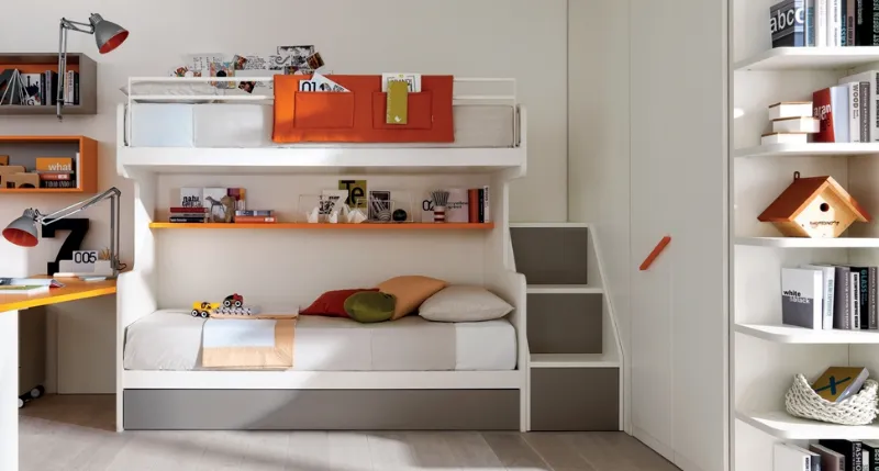 La soluzione di castello con scrivania permette di avere un letto a castello anche in una cameretta singola, accontentando il bambino che vorrebbe dormire in alto.