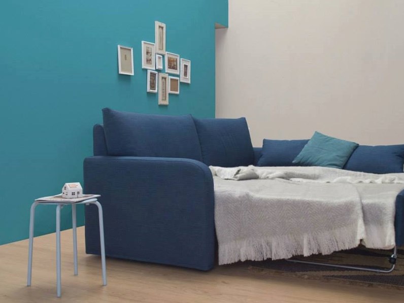 Divano letto in tessuto blu sfoderabile con materasso alto.